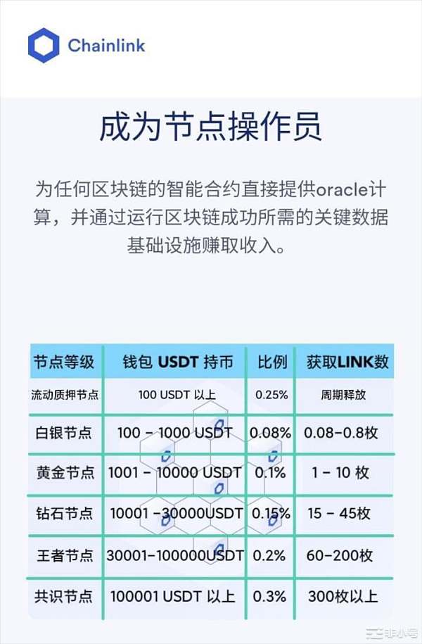 社区激励计划的申请人应致力于在项目中使用Chainlink开发具有通用连接性的智能合约,并提升Chainlink网络的功能,为更多区块链环境提供更多优质数据。社区激励用于节点结算将以LINK通证的形式发放。