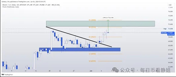 与此同时,比特币价格突破了下跌楔形并走高。价格走势高于 50 日和 200 日 SMA,表明投资者看好该资产。有一个强大的上方阻力区威胁着 BTC 多头。然而,如果他们突破它,BTC 价格可能会创下历史新高。相反,支撑位在 69,000 左右。