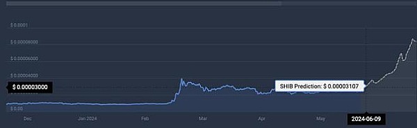 根据 CoinCodex 的数据,SHIB 可能会在 2024 年 6 月 9 日星期日飙升至 0.00003107 美元,较当前水平上涨约 21.32%。此外,该平台预测 SHIB 将在 2024 年 7 月 3 日创下 0.00008723 美元的历史新高。从当前水平达到 0.00008723 美元将意味着增长约 240.6%。