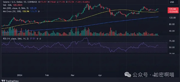 截至发稿,Solana 价格已跌至 170.5 美元左右,跌幅超过 1%,虽然跌幅相对较小,但市值已损失近 20 亿美元,尽管价格下跌,但整体趋势仍然向好。
