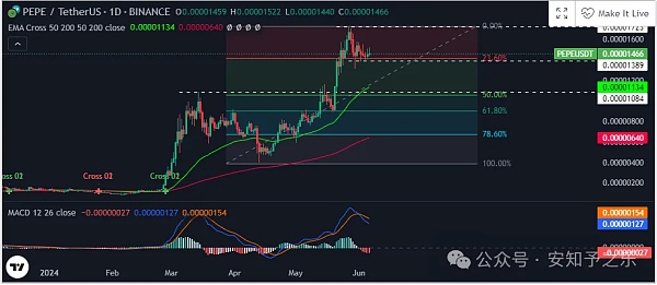 尽管PEPE最近从历史高点回落了20%,但仍显示出看涨迹象。价格目前在关键的移动平均线以上交易,并且维持在23.6%的斐波纳契回撤位的支撑位。