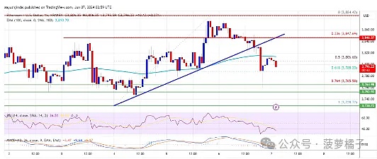 以太坊目前交易价格低于 3,840 美元和 100 小时简单移动平均线。不过,多头在 3,730 美元的摆动低点至 3,885 美元的高点的上行波的 61.8% 斐波那契回撤位附近活跃。