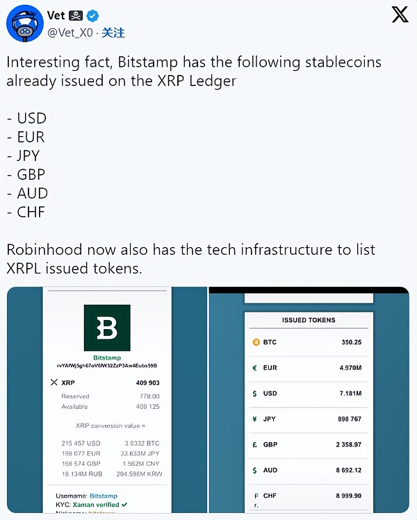 值得注意的是,支持 XRP 在此次收购后可能在 Robinhood 上市的论据包括 Bitstamp 对 XRP 账本的大力支持。例如,Bitstamp 在 XRP 账本上发行了美元、欧元、日元、英镑、澳元和瑞士法郎的稳定币。