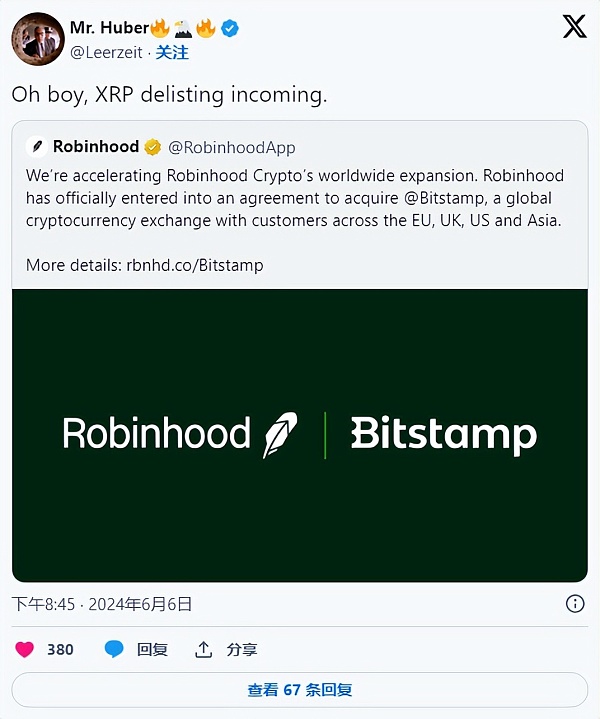 与此同时,加密货币侦探 Huber 先生则不那么乐观。针对即将到来的收购,他表示 Robinhood 可能会在交易完成后将 XRP 从 Bitstamp 平台上下架。
