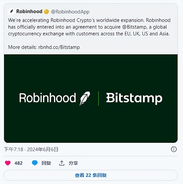 根据官方通知,Robinhood 收购 Bitstamp 将把 Bitstamp 广泛的加密货币交易所业务整合到 Robinhood 平台中,为英国、美国、欧盟和亚洲的零售和机构客户提供服务。