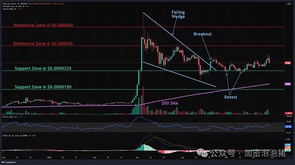 根据知名加密货币分析平台altFINS的见解,$SHIB价格趋势显示出一系列重要的特征。他们指出,价格从下降楔形模式中突破并进入看涨趋势后,仍然处于上升轨道。价格已成功重新测试突破水平,并可能在不久的将来升至0.000035美元。