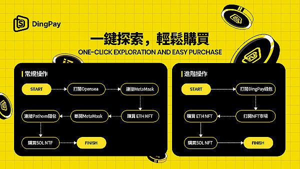 举个例子,假设我们在某个NFT市场看中了以太坊和 Solana 上的 NFT,以往我们需要切换两个钱包,分别连接两个账户,费时费力;而现在只需要拥有DingPay,就可以从中探索NFT市场,只需要一次点击,就可以直接在两个生态购买 NFT,简单易用,方便快捷。