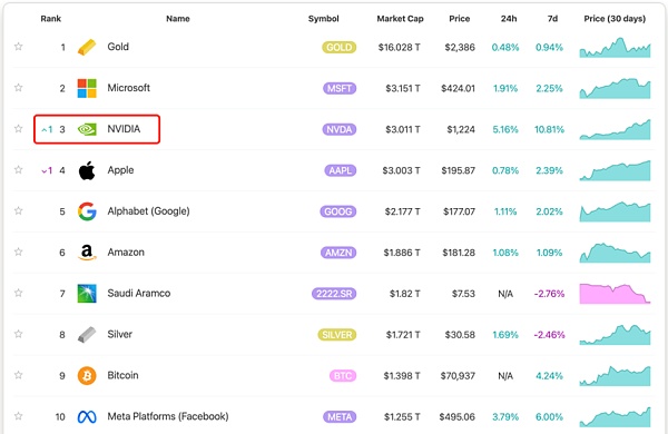 最近,英伟达市值一度突破了3万亿美元,超过了苹果公司,排名仅次于微软。