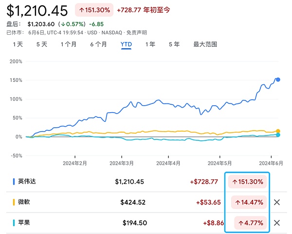 在这三家市值超过 3 万亿美元的上市公司中,要属英伟达的成长速度最快,对比微软、苹果以及英伟达三大公司的股价变化,从年初至今,微软股票上涨了 14.47%,苹果股票上涨了 4.77%,而英伟达股票则上涨了 151.5%,涨幅远远高于苹果和微软。