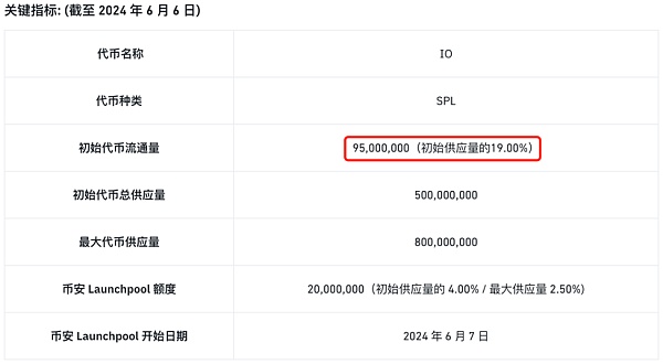 IO 代币的初始流通量为 9500万枚,也就是在6月11日开始上线交易时的初始代币流通量,占代币总供应量的 11.875%,基本和币安 Launchpad 最近上线的项目代币初始流通量不相上下。