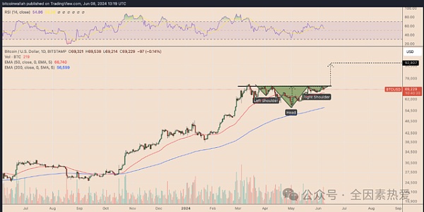 然而,这一阻力位似乎是比特币现行的倒头肩 (IH&S) 形态的颈线。当价格突破颈线并上涨至形态最低点与颈线之间的最大距离时,这种经典的看涨反转形态就会消失。