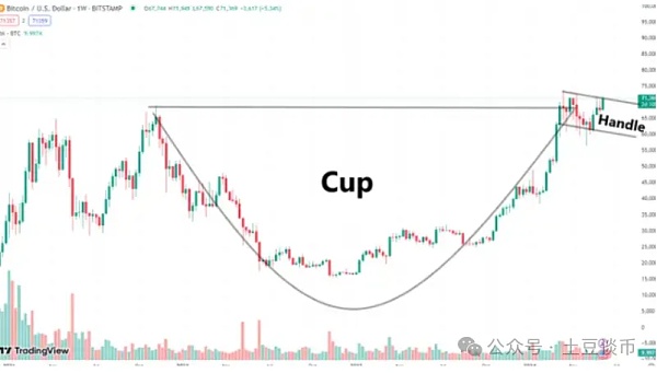 现在加密货币正在形成一种经典的技术形态,称为“杯柄”。这是一种类似杯子的看涨形态,由一个通常呈“U”形的底部形态和随后的由短期下跌趋势形成的柄组成。