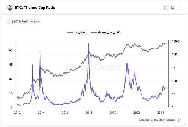 该分析公司首席执行官还表示,从网络基本面来看,比特币目前并未被高估。Young Ju 引用了 BTC 的“热帽比率”作为证据。