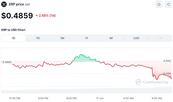 Ripple Labs 推出的加密货币XRP在过去 24 小时内价格下跌 2.68% 至 0.4859 美元。XRP 的 24 小时最低价和最高价分别为 0.4849 美元和 0.5053 美元。