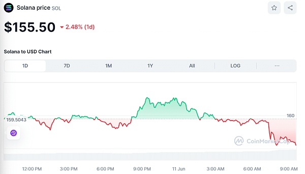 加密货币SOL 的价格在过去 24 小时内下跌了 2.48%,至 155.50 美元。该代币的 24 小时最低价和最高价分别为 155.22 美元和 162.83 美元。