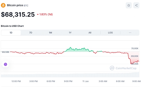 BTC 的价格在过去 24 小时内下跌了 1.83%,目前交易价为 68,315 美元。其 24 小时最低价和最高价分别为 67,905.26 美元和 70,146.84 美元。今天 BTC 的交易价格达到 67,000 美元大关并不令人意外。