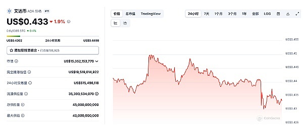 或受近期加密货币市场下跌趋势影响,Chang 硬分叉升级的利好消息似乎未能体现在Cardano 原生代币ADA 的价格上,截稿前报0.433 美元,近24 小时下跌1.9%,近一周跌幅达5.8% 。至于后续ADA 价格是否会随着升级消息发酵而增长,值得我们持续关注。