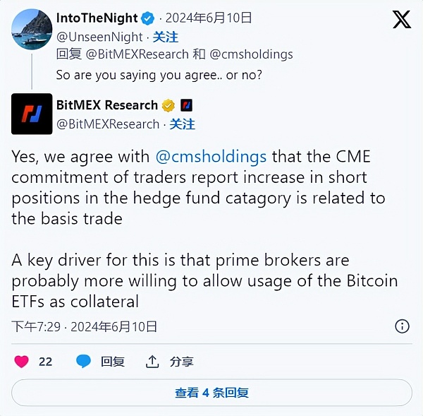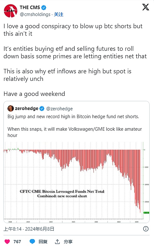 空头仓位激增可能与基础交易有关,对冲基金通过密切追踪现货价格的 ETF 购买比特币,同时出售期货合约。