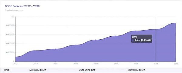机器学习算法“价格预测”预测,狗狗币可能在 2029 年的某个时候突破其 0.73 美元的历史最高点。该预测估计,即使到 2030 年末,狗狗币也可能永远不会达到 1 美元。