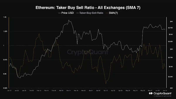 根据 CryptoQuant 的报告,由于以太坊的价格难以突破 4,000 美元大关,交易员可能需要关注期货市场参与者的行为。下图显示了 Taker 买卖比率的 7 天移动平均线,该比率衡量了买家与卖家的相对积极性。高于 1 的值表示买家占主导地位,而低于 1 的值表示积极抛售。