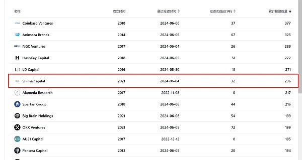Shima Capital 在成立的三年间投资超过 200个项目(去年9月这个数字还是100+),比较知名的项目包括Wombat Exchange、Berachain、Monad Network、Polkadot、Solv Protocol、Meson Network、Galxe、1inch、Coin98 等,最近一笔披露的投资是在 6 月 4日,在 RootData 的活跃投资者榜单上排名第六,而且也是2022、2023年连续两年出手次数最多的VC之一。