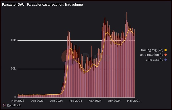 根据 Pixelhack 创建的 Dune Analytics 数据显示,5 月 20 日 Farcaster 的日活跃用户数达到近 4.5 万人,与 2 月 11 日因推出 Frames(一种将帖子转变为交互式应用的功能)引发的活跃度热潮相比增长了 30%。但这一数据,与 Facebook、TikTok 和 X(前身为推特)等主流社媒巨头相比,相差甚远。