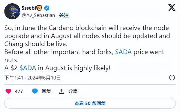 “因此,6 月份,Cardano 区块链将进行节点升级,8 月份,所有节点都应更新,Chang 也应上线。在所有其他重要硬分叉之前,ADA 价格已经疯涨。8 月份 ADA 价格达到 2 美元的可能性很大。”
