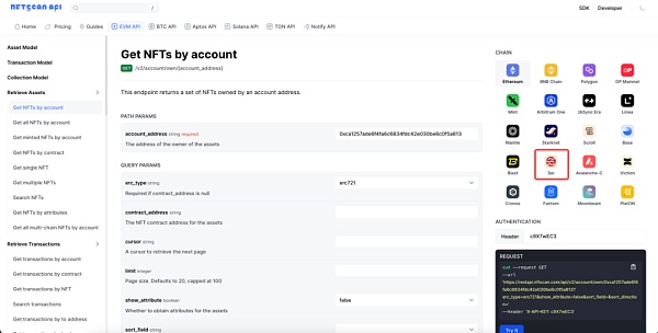 目前,NFTScan 开发者平台也已经同步上线了 Sei 网络的 NFT API 数据服务,目前对外开放了多个 API 查询接口,满足各种业务场景下对 Sei NFT 数据的索引需求。如果你是 NFT 和 Web3 领域的开发者,欢迎使用 NFTScan 开发者平台提供的 Sei 网络的 NFT API 数据服务,低门槛的快速在 Sei 网络上构建产品和协议。