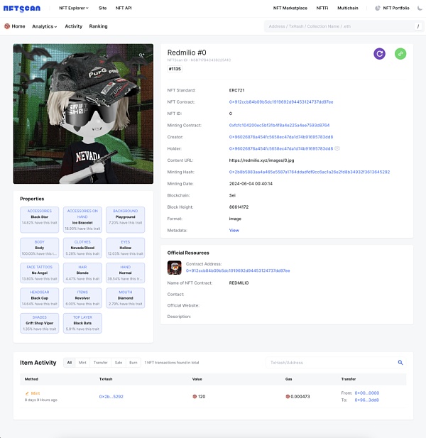 根据 Sei NFTScan 的数据显示:截止到 2024 年 6 月 12 日,Sei 网络上共发行了 27,722 枚 NFT 资产,累计发布了 177 个 NFT Collection 项目,共产生了 29,370 条链上交互记录,有过交互的钱包地址 3,919 个,共累计交易额 11,993.51 SEI。