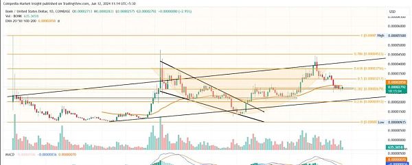 随着上升通道模式出现负周期,BONK 价格跌破 50D EMA。此外,模因币跌破 50% 斐波那契水平的关键水平和 0.000030 美元的心理关口。