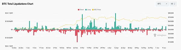 根据监控资源CoinGlass的数据,比特币在前一天一度跌至 66,000 美元,引发总额超过 5000 万美元的多头清算。