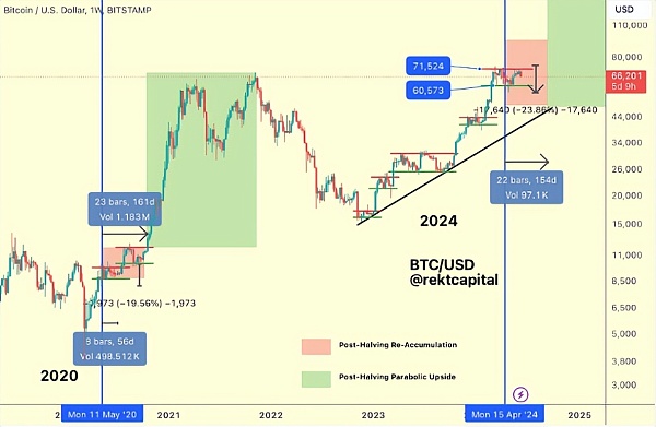 “历史胜过一切”,著名交易员兼分析师 Rekt Capital在将本次 BTC 价格周期与之前的价格周期进行比较时继续说道。