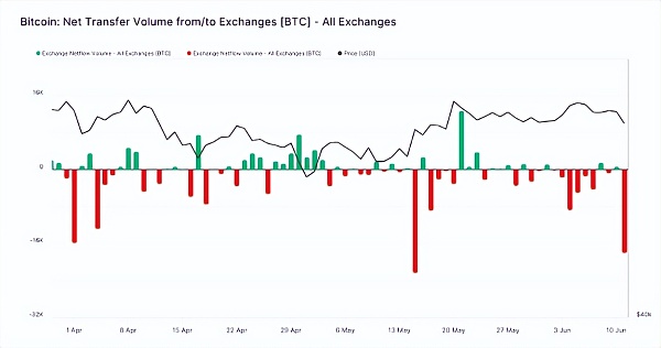 链上分析平台Glassnode数据显示,6 月 11 日交易所的净转账量为 17,967 BTC(12.1 亿美元)。