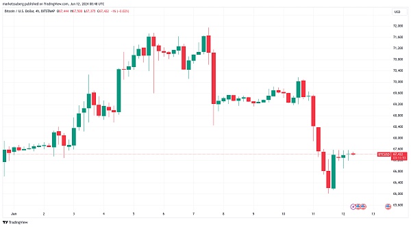 在跨加密货币暴跌引发大量交易所提款后,比特币(BTC )于 6 月 12 日回到 67,500 美元的区间。