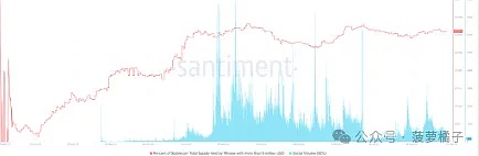 鲸鱼持有的稳定币总供应量中超过 500 万美元的百分比表明,社交量的激增与鲸鱼积累的时期之间存在共存的相关性。