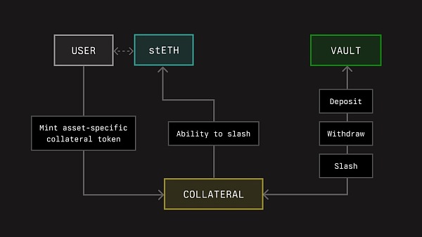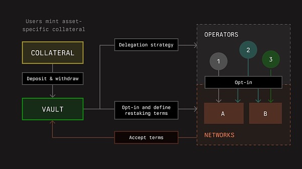 抵押代币由拥有资产或想要再质押头寸的用户铸造并存入财库,财库会将抵押品委托给 Symbiotic 网络中的运营商。财库定义可接受的抵押品,而网络需要接受财库抵押品和财库条款(如罚没限额)才能获得奖励。