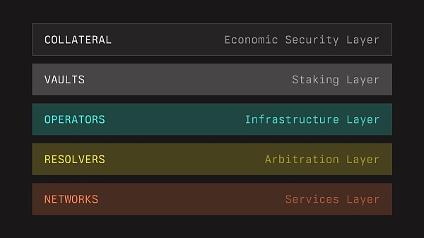 Symbiotic 协议由 5 个相互关联的模块组成,包括经济安全层的抵押品、质押层的财库、基础设施层的运营商、仲裁层的解决者(Resolver)以及服务层的网络。