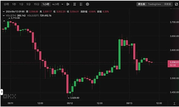 以太坊走势类似,昨晚最高来到3,657 美元之后,撰稿时已回落至3,556 美元,近24 小时上涨2.03%。