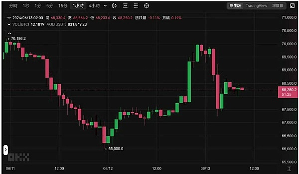 不过或许因Fed 点阵图降低今年降息预期,比特币稍晚又向下回调,涨幅几乎全数回吐,撰稿时报68,250 美元,近24 小时上涨1.57%。