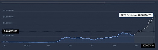 加密货币分析公司 CoinCodex 认为,以青蛙为主题的加密货币可能会在未来几周内进入反弹阶段。该平台的数据显示,memecoin 可能会在 2024 年 6 月 18 日创下 0.00001822 美元的历史新高。达到 0.00001822 美元将比当前价格水平上涨约 38%。此外,CoinCodex 数据显示,PEPE 的价格可能会在 2024 年 7 月 10 日攀升至 0.00004472 美元,比当前水平上涨近 240%。