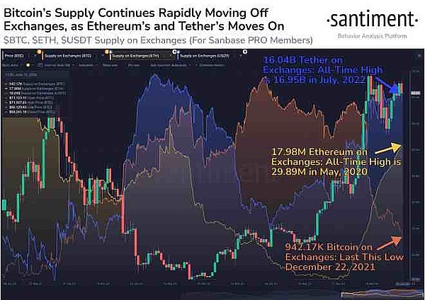 根据链上数据提供商 Santiment 的数据,自 2021 年 12 月以来,交易所的比特币总供应量已降至 100 万以下,至 942,000 比特币,这是近三年来首次出现这种情况。