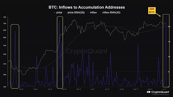 根据 CryptoQuant 的最新数据,在本周早些时候的市场调整中,超过 20,000 个比特币流入了鲸鱼钱包。这表明,大型投资者一直在利用市场的每一次下跌,同时增加持股量。