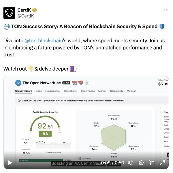 CertiK与TON的合作不仅体现在技术和审计层面,更包括紧密的社区互动。CertiK与TON社区保持积极沟通,共同推进项目发展。2024年4月,CertiK发布了一篇关于TON的案例展示,阐述了TON如何凭借全球最快的区块链速度、顶级安全性及强大的社区治理,确立了区块链技术的新标准。TON对安全的承诺通过多次全面的审计得以体现,TON在Skynet平台上获得了92.19分的AA级CertiK评分(此为动态评分)。