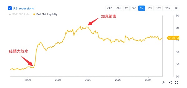 从美元流动性的图表走势看,2020年疫情大放水后,美元流动性极速提升,随后美股和加密市场走牛;2022年初,美联储加息缩表,流动性降低,美股和加密市场走熊;2023年美联储动用金融工具救助硅谷银行破产后恐慌蔓延的银行业,美元流动性企稳,美股和加密市场再次走牛。