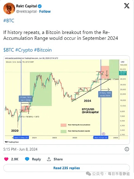 尽管根据默滕的分析,短期内比特币价格看起来看跌,但市场分析师Rekt Capital 提供了一些背景信息,他发布的一张图表显示,比特币价格仅处于典型的减半后疲软期的一半,并暗示下一次突破可能出现在9 月份。
