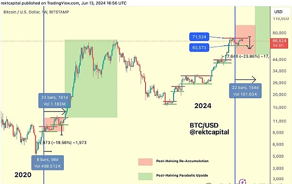 比特币从未在减半后这么早就出现突破。如果真的出现突破,那么周期将加速到牛市比平时更短的程度。这种持续的盘整使价格能够与历史减半周期重新同步