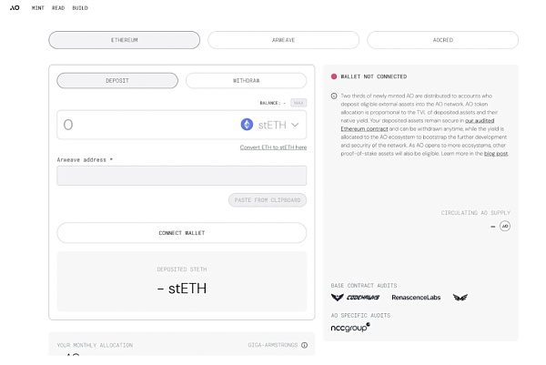 在初始阶段,用户可以存入 stETH(使用 Lido 质押的 ETH)来在 AO 中累积代币奖励。随着 AO 向更多生态系统开放,其他权益证明资产也将符合条件。