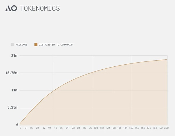 与比特币类似,AO 的总供应量为 2100 万个代币,并且每 4 年会进行一次减半。AO 每 5 分钟分发一次,每月的分发量为剩余供应量的 1.425%。截至 6 月 13 日,AO 的存量为 103.87 万个,使得其变得非常稀缺。相比之下,以太坊有 1.2 亿个代币,Solana 有 4.61 亿个代币,瑞波币有 550 亿个代币。