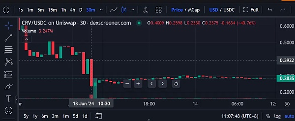 随后,CRV代币从0.35美元一路跳水至最低点0.21美元,日内跌幅一度超过40%,创下历史新低。