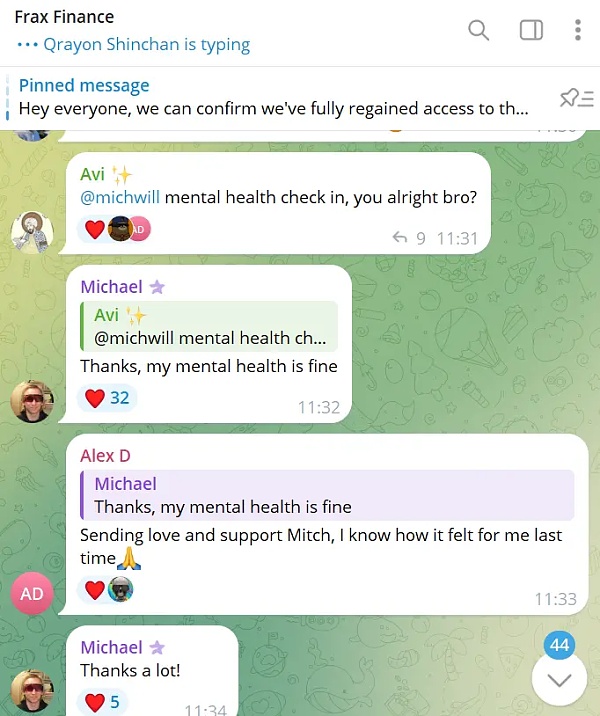 面对CRV这次大规模仓位清算,创始人Michael Egorov的表现更让人吃惊,他在整个清算过程中没有任何发声,甚至无动于衷,既没有主动补仓也没有任何补救行动,且在仓位清算发生的6月13日上午,还在Frax Finance社区与用户调侃,表示自己的精神状态很健康。